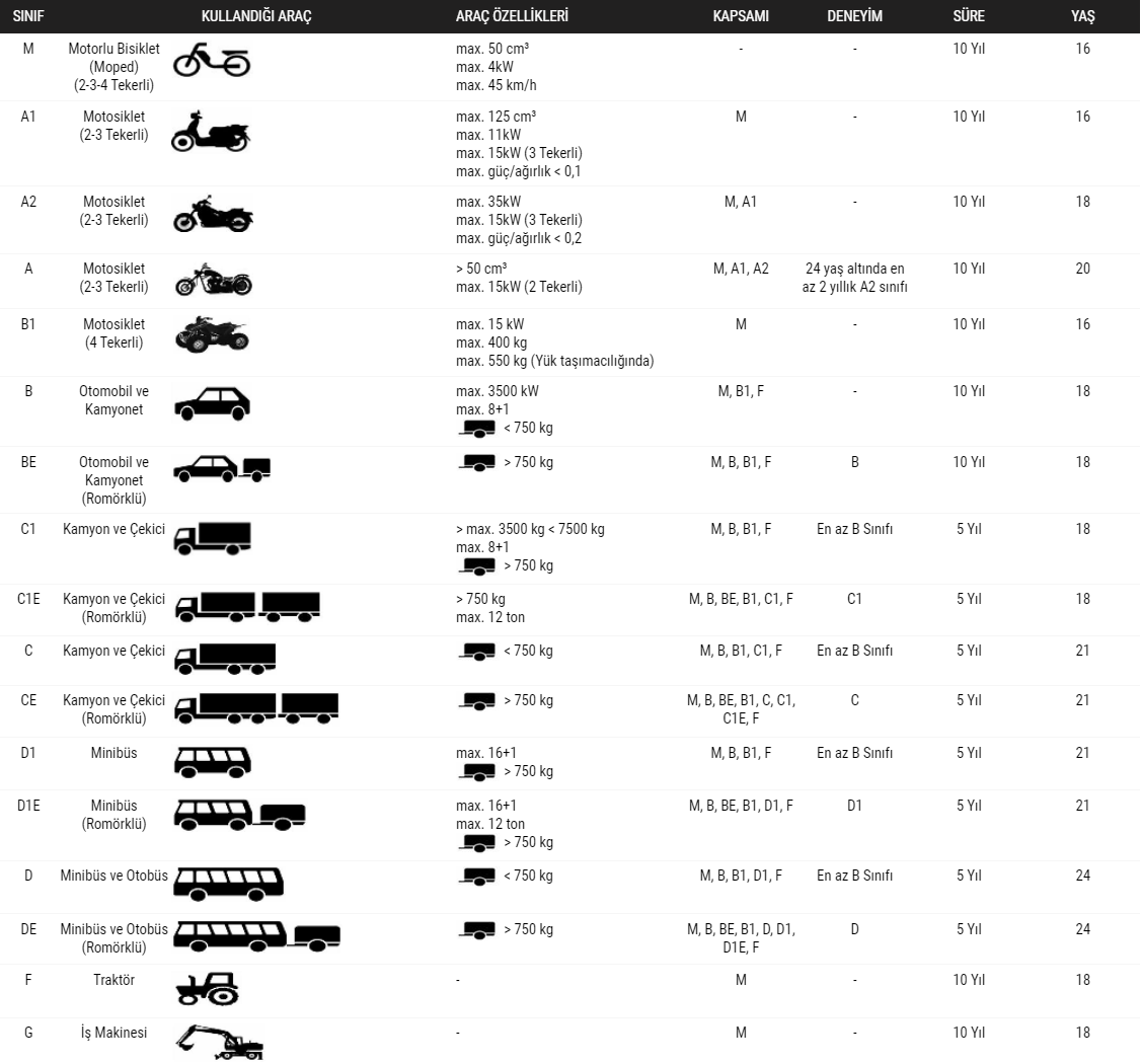 A2, B, BE, C1, C1E, F ve G gibi en çok tercih edilen ehliyetler için 18 yaşını doldurmak gerekiyor.